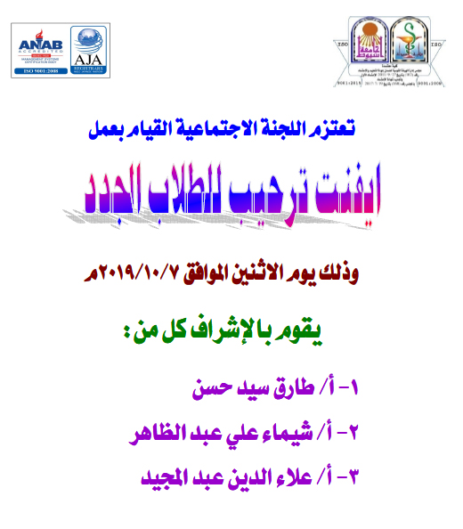 اللجنة الاجتماعية بكلية الصيدلة تقوم بعمل ايفنت ترحيب للطلاب الجدد يوم الاثنين الموافق 7-10-2019م. 3 أكتوبر 2019 اللجنة الاجتماعية بكلية الصيدلة تقوم بعمل ايفنت ترحيب للطلاب الجدد يوم الاثنين الموافق 7-10-2019م.