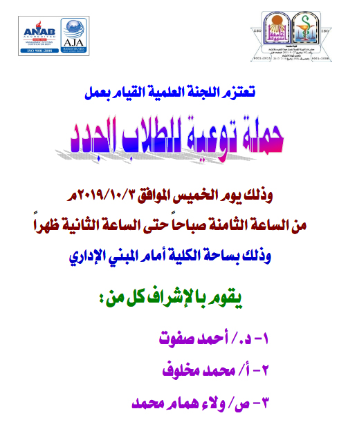 اللجنة العلمية بكلية الصيدلة تقوم بعمل حملة توعية للطلاب الجدد يوم الخميس الموافق 3-10-2019م من الساعة الثامنة صباحاً. 2 أكتوبر 2019 اللجنة العلمية بكلية الصيدلة تقوم بعمل حملة توعية للطلاب الجدد يوم الخميس الموافق 3-10-2019م من الساعة الثامنة صباحاً.