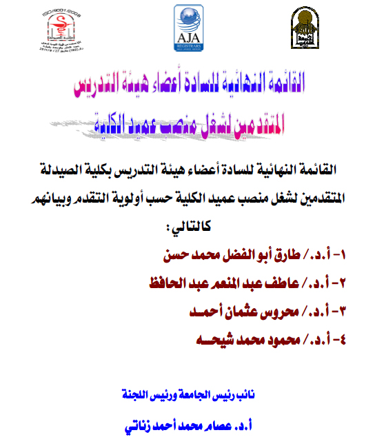 القائمة النهائية للسادة أعضاء هيئة التدريس بكلية الصيدلة المتقدمين لشغل منصب عميد الكلية. 26 يناير 2017 القائمة النهائية للسادة أعضاء هيئة التدريس بكلية الصيدلة المتقدمين لشغل منصب عميد الكلية.