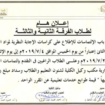 تحدد يوم الخميس الموافق 25/7/2019م في تمام الساعة الواحدة ظهراً لمناقشة الرسالة المقدمة من