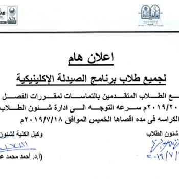 سوف يعقد بمشيئة الله تعالي اجتماع اللجنة الإدارية العليا لبرنامج الصيدلة الإكلينيكية بكلية الصيدلة وذلك يوم الأربعاء الموافق 24-7-2019م في تمام الساعة الثانية عشر ظهراً بقاعة مكتب السيد الأستاذ…