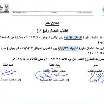 هام جدا لطلاب فصل رقم 8 صيدلة إكلينيكية .. الموعد المعدل النهائي لعقد امتحاني تفاعلات الأدوية والكيمياء الإكلينيكية.