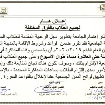 سوف يعقد بمشيئة الله تعالي اجتماع لجنة العلاقات الثقافية والخارجية بكلية الصيدلة يوم الأحد الموافق 12-5-2019م الساعة الثانية عشر ظهراً بمكتب السيد الأستاذ الدكتور/ وكيل الكلية لشئون الدراسات العليا…