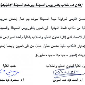 هام لطلاب بكالوريوس الصيدلة وبرنامج الصيدلة الإكلينيكية .. سوف يتم عمل امتحان تجريبي تمهيداً للامتحان القومي لمزاولة مهنة الصيدلة لعدد 200 طالب وطالبة من طلاب السنة النهائية.
