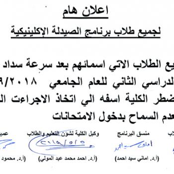 لجميع طلاب برنامج الصيدلة الإكلينيكية الذين لم يسددوا رسوم الفصل الدراسي الثاني للعام الجامعي 2018-2019م .. ضرورة سرعة سداد الرسوم حتى يتسنى لهم دخول الامتحانات.