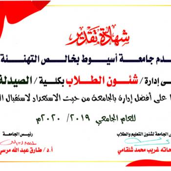 عميد كلية الصيدلة وأسرة الكلية يقدمون خالص التهنئة لإدارة شئون الطلاب بالكلية لحصولها علي أفضل إدارة بالجامعة من حيث الاستعداد لاستقبال الطلاب للعام الجامعي 2019-2020م.