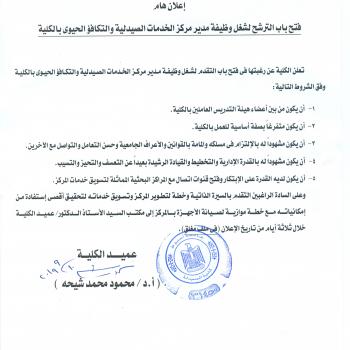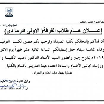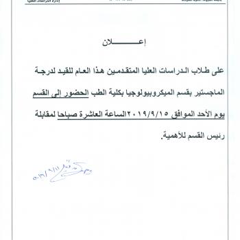 على طلاب الدراسات العليا المتقدمين هذا العام للقيد لدرجة الماجستير بقسم الميكروبيولوجيا بكلية الطب الحضور الى القسم يوم الأحد الموافق 15/9/2019 الساعة العاشرة صباحا لمقابلة رئيس القسم للأهمية.