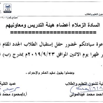 سوف يعقد بمشيئة الله تعالي اجتماع لجنة العلاقات الثقافية والخارجية بكلية الصيدلة يوم الأربعاء الموافق 11-9-2019م الساعة الحادية عشر صباحا بمكتب السيدة الأستاذ الدكتورة/ وكيل الكلية لشئون الدراسات…