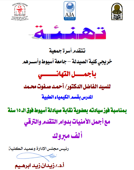 أسرة جمعية خريجي كلية الصيدلة – جامعة أسيوط وأسرهم تتقدم بخالص التهنئة للسيد الدكتور/ أحمـد صـفوت محـمد بمناسبة فوز سيادته بعضوية نقابة صيادلة أسيوط فوق الـ 15 سنة.