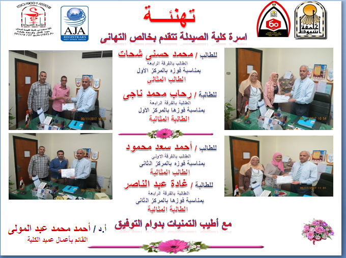 أسرة كلية الصيدلة تهنئ أبناءها الطلاب الفائزين في مسابقة الطالب المثالي والطالبة المثالية بالمركزين الأول والثاني علي مستوي الكلية. 7 نوفمبر 2017 أسرة كلية الصيدلة تهنئ أبناءها الطلاب الفائزين في مسابقة الطالب المثالي والطالبة المثالية بالمركزين الأول والثاني علي مستوي الكلية.
