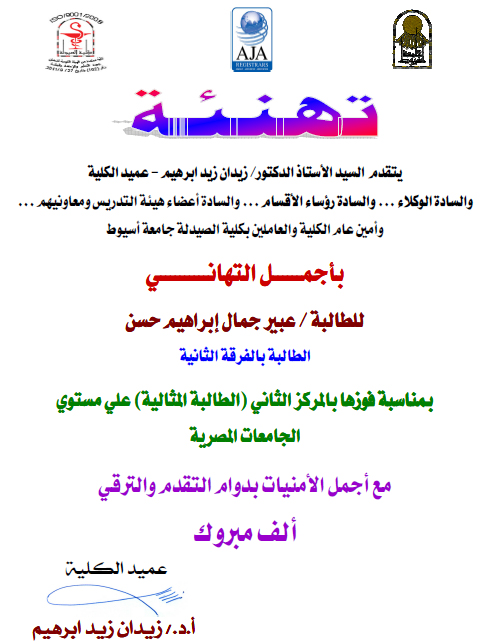 أسرة كلية الصيدلة تهنئ الطالبة/ عبير جمال ابراهيم لفوزها بالمركز الثاني في مسابقة الطالبة المثالية علي مستوي الجمهورية للعام الجامعي 2014/2015م. 7 مايو 2015 أسرة كلية الصيدلة تهنئ الطالبة/ عبير جمال ابراهيم لفوزها بالمركز الثاني في مسابقة الطالبة المثالية علي مستوي الجمهورية للعام الجامعي 2014/2015م.