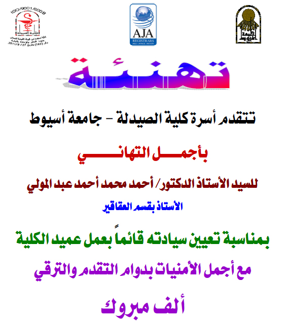 أسرة كلية الصيدلة تتقدم بخالص التهنئة للسيد الأستاذ الدكتور: أحمد محمد عبد المولي بمناسبة تعيين سيادته قائما بعمل عميد لكلية الصيدلة جامعة أسيوط. 16 نوفمبر 2017 أسرة كلية الصيدلة تتقدم بخالص التهنئة للسيد الأستاذ الدكتور: أحمد محمد عبد المولي بمناسبة تعيين سيادته قائما بعمل عميد لكلية الصيدلة جامعة أسيوط.