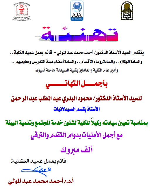 أسرة كلية الصيدلة تتقدم بخالص التهنئة للسيد الأستاذ الدكتور: محمود البدري عبد المطلب بمناسبة تعيين سيادته وكيلاً لكلية الصيدلة لشئون خدمة المجتمع وتنمية البيئة.
