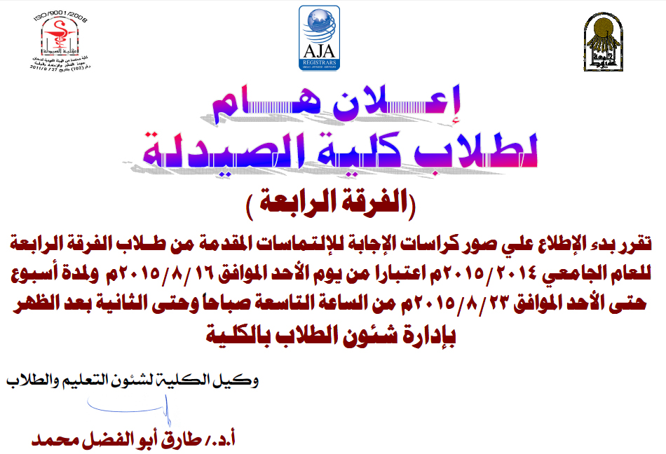 بدء الإطلاع علي صور كراسات الإجابة للإلتماسات المقدمة من طلاب الفرقة الرابعة اعتبارا من يوم الأحد الموافق 16/8/2015م. 15 أغسطس 2015 بدء الإطلاع علي صور كراسات الإجابة للإلتماسات المقدمة من طلاب الفرقة الرابعة اعتبارا من يوم الأحد الموافق 16/8/2015م.