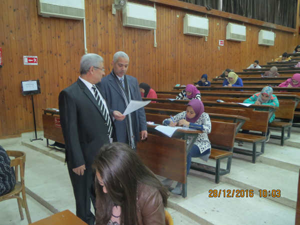 في صباح يوم الثلاثاء الموافق 27/12/2017م ، ومع بداية إمتحانات الفصل الدراسي الأول للعام الجامعي 2016/2017م قام السيد الأستاذ الدكتور/ محروس عثمان أحمد – القائم بأعمال عميد الكلية ، والسيد الأستاذ الدكتور/ أحمد محمد أحمد عبد المولى - وكيل الكلية لشئون التعليم والطلاب بجولة تفقدية للجان إمتحانات الفصل الدراسي الأول بمجمع المدرجات وصالات الإمتحانات.