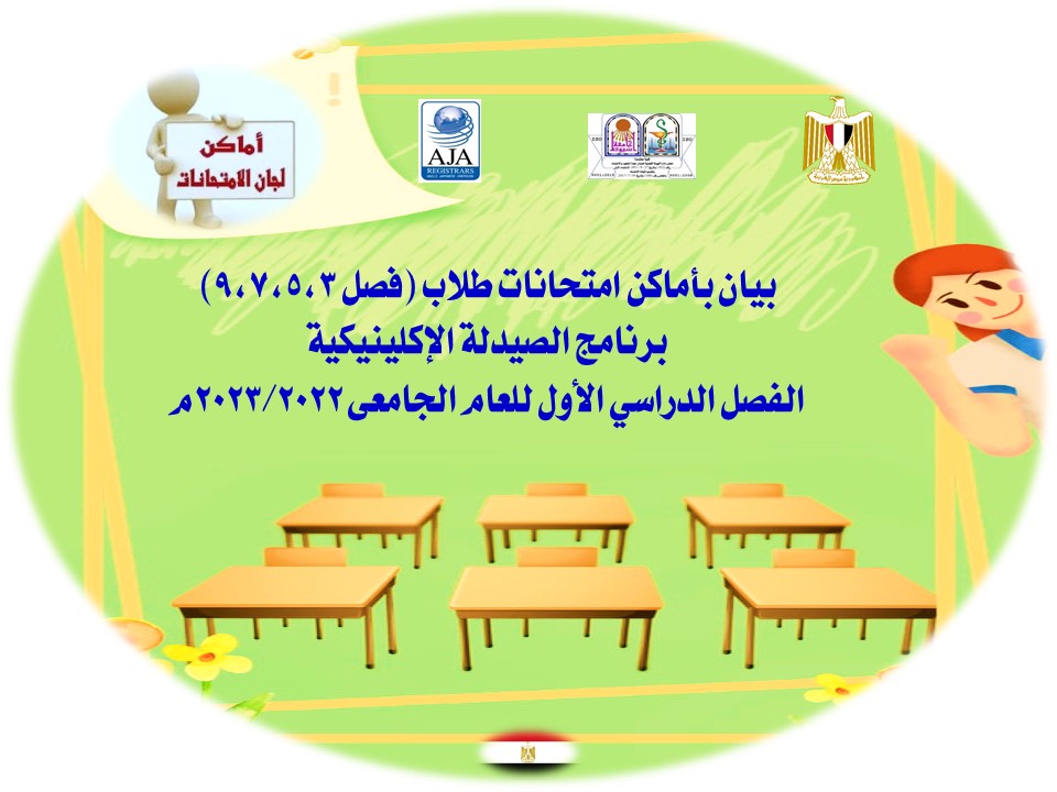 بيان بأماكن امتحانات طلاب (فصل 9،7،5،3) برنامج الصيدلة الإكلينيكية الفصل الدراسي الأول للعام الجامعى 2022/2023م 26 ديسمبر 2022