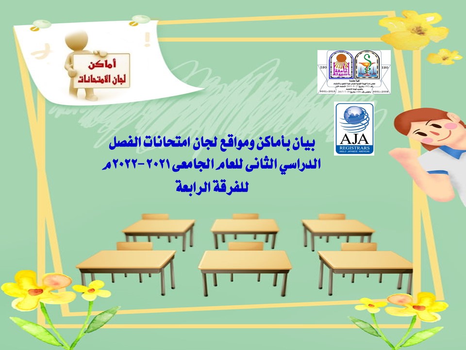 بيان بأماكن ومواقع لجان امتحانات الفصل الدراسي الثانى للعام الجامعى 2021-2022م للفرقة الرابعة 17 مايو 2022