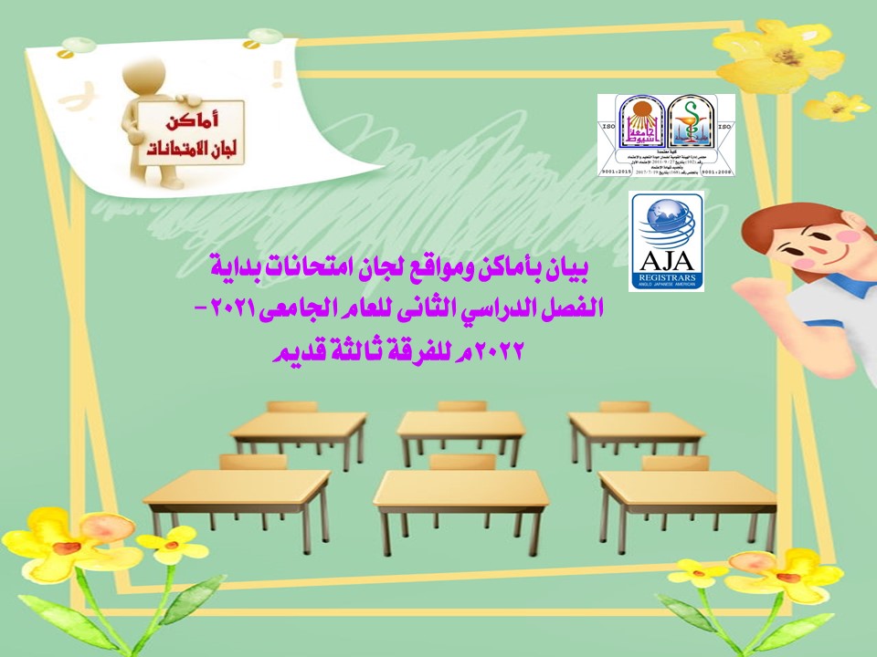 بيان بأماكن ومواقع لجان امتحانات بداية الفصل الدراسي الثانى للعام الجامعى 2021-2022م للفرقة ثالثة قديم 17 مايو 2022