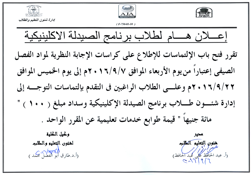 فتح باب الالتماسات لمواد الفصل الصيفي لبرنامج الصيدلة الإكلينيكية اعتباراً من 7/9/2016م. 7 سبتمبر 2016 فتح باب الالتماسات لمواد الفصل الصيفي لبرنامج الصيدلة الإكلينيكية اعتباراً من 7/9/2016م.