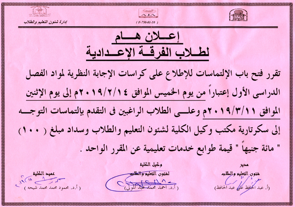 فتح باب الالتماسات لطلاب الفرقة الإعدادية لمواد الفصل الدراسي الأول من العام الجامعي 2018-2019م يبدأ من يوم الخميس الموافق 14-2-2019م. 19 فبراير 2019 فتح باب الالتماسات لطلاب الفرقة الإعدادية لمواد الفصل الدراسي الأول من العام الجامعي 2018-2019م يبدأ من يوم الخميس الموافق 14-2-2019م.