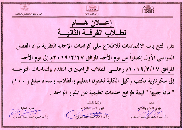 فتح باب الالتماسات لطلاب الفرقة الثانية لمواد الفصل الدراسي الأول من العام الجامعي 2018-2019م يبدأ من يوم الأحد الموافق 17-2-2019م. 19 فبراير 2019 فتح باب الالتماسات لطلاب الفرقة الثانية لمواد الفصل الدراسي الأول من العام الجامعي 2018-2019م يبدأ من يوم الأحد الموافق 17-2-2019م.