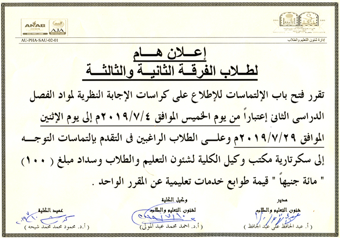 فتح باب الالتماسات لطلاب الفرقة الثانية والثالثة لمواد الفصل الدراسي الثاني من العام الجامعي 2018-2019م يبدأ من يوم الخميس الموافق 4-7-2019م.