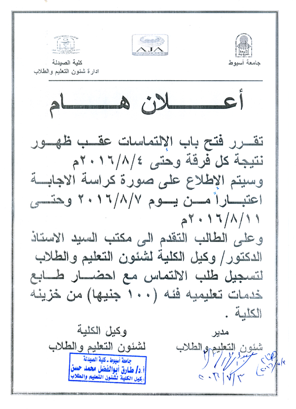 فتح باب الالتماسات لطلاب برنامج العلوم الصيدلية بكلية الصيدلة عقب ظهور نتيجة كل فرقة وحتى 4/8/2016م. 4 يوليو 2016 فتح باب الالتماسات لطلاب برنامج العلوم الصيدلية بكلية الصيدلة عقب ظهور نتيجة كل فرقة وحتى 4/8/2016م.