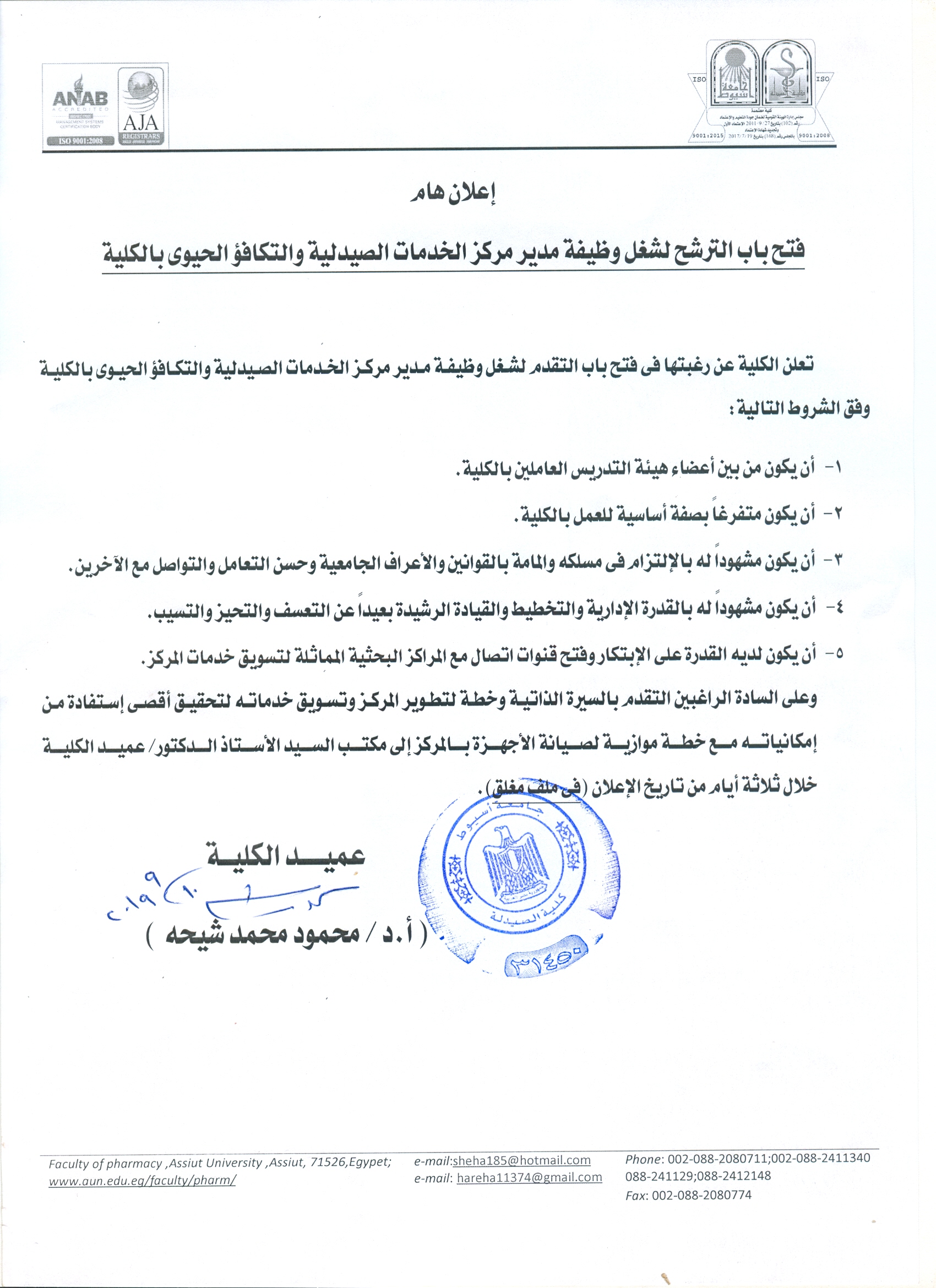 فتح باب الترشيح لشغل وظيفة مدير مركز الخدمات الصيدلية والتكافؤ الحيوى بالكلية. 10 سبتمبر 2019 فتح باب الترشيح لشغل وظيفة مدير مركز الخدمات الصيدلية والتكافؤ الحيوى بالكلية.