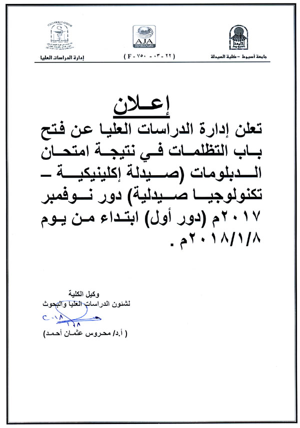 فتح باب التظلمات في نتيجة امتحان دبلوم صيدلة إكلينيكية ودبلوم تكنولوجيا صيدلية لدور نوفمبر 2017م بدءأ من يوم 8-1-2018م. 9 يناير 2018 فتح باب التظلمات في نتيجة امتحان دبلوم صيدلة إكلينيكية ودبلوم تكنولوجيا صيدلية لدور نوفمبر 2017م بدءأ من يوم 8-1-2018م.