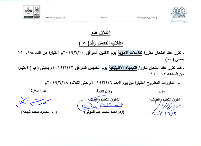 هام جدا لطلاب فصل رقم 8 صيدلة إكلينيكية .. الموعد المعدل النهائي لعقد امتحاني تفاعلات الأدوية والكيمياء الإكلينيكية. 2 يونيو 2019 هام جدا لطلاب فصل رقم 8 صيدلة إكلينيكية .. الموعد المعدل النهائي لعقد امتحاني تفاعلات الأدوية والكيمياء الإكلينيكية.