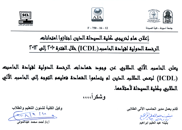 هام لخريجي كلية الصيدلة الذين اجتازوا امتحانات الرخصة الدولية لقيادة الحاسب خلال الفترة 2010م إلي 2012م لاستلام الشهادة. 19 سبتمبر 2018 هام لخريجي كلية الصيدلة الذين اجتازوا امتحانات الرخصة الدولية لقيادة الحاسب خلال الفترة 2010م إلي 2012م لاستلام الشهادة.
