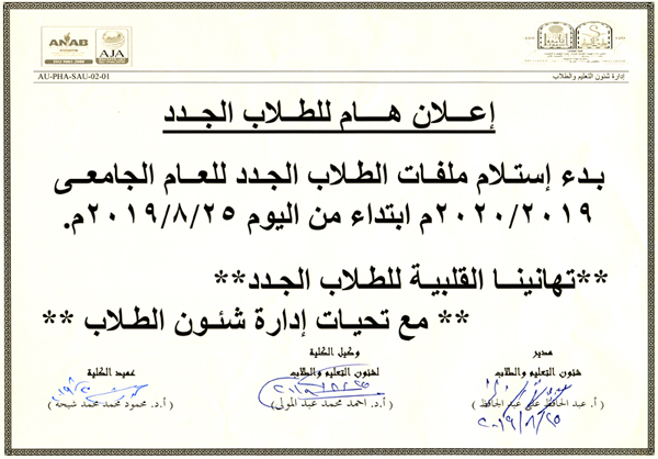 هام للطلاب الجدد .. استلام ملفات الطلاب الجدد للعام الجامعي 2019-2020م بدءاً من اليوم 25-8-2019م. 25 أغسطس 2019 هام للطلاب الجدد .. استلام ملفات الطلاب الجدد للعام الجامعي 2019-2020م بدءاً من اليوم 25-8-2019م.