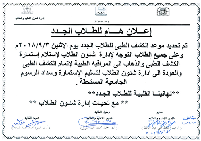 هام للطلاب الجدد .. تم تحديد موعد الكشف الطبي لطلاب صيدلة الجدد 2018-2019م يوم الاثنين الموافق 3-9-2018م. 28 أغسطس 2018 هام للطلاب الجدد .. تم تحديد موعد الكشف الطبي لطلاب صيدلة الجدد 2018-2019م يوم الاثنين الموافق 3-9-2018م.