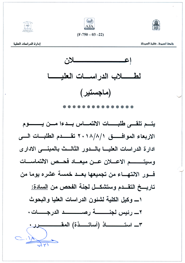هام لطلاب الدراسات العليا (ماجستير) .. فتح باب الالتماسات للإطلاع علي كراسات الإجابة النظرية لامتحان المقررات الدراسية العامة والخاصة لطلاب الماجستير في العلوم الصيدلة – دور يونيو 2018م (الدور الأول).