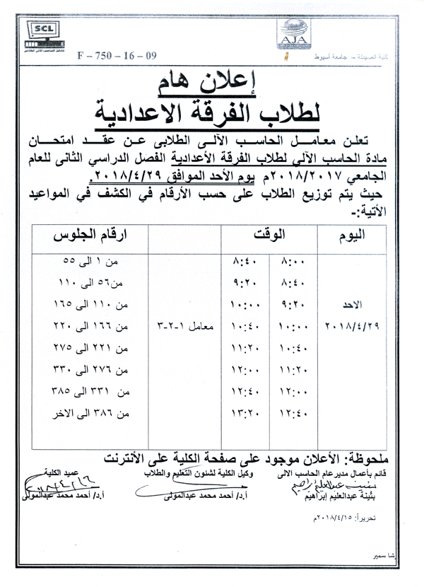 هام لطلاب الفرقة الإعدادية .. تقرر عقد امتحان مادة الحاسب الآلي يوم الأحد الموافق 29-4-2018م. 18 أبريل 2018 هام لطلاب الفرقة الإعدادية .. تقرر عقد امتحان مادة الحاسب الآلي يوم الأحد الموافق 29-4-2018م.
