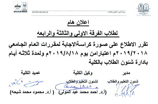 هام لطلاب الفرقة الأولي والثالثة والرابعة المتقدمين بالتماسات .. الإطلاع علي الصورة الضوئية من كراسة الإجابة عن مواد الفصل الدراسي الثاني 2018-2019م بدءاً من 18-8-2019م ولمدة ثلاثة أيام.