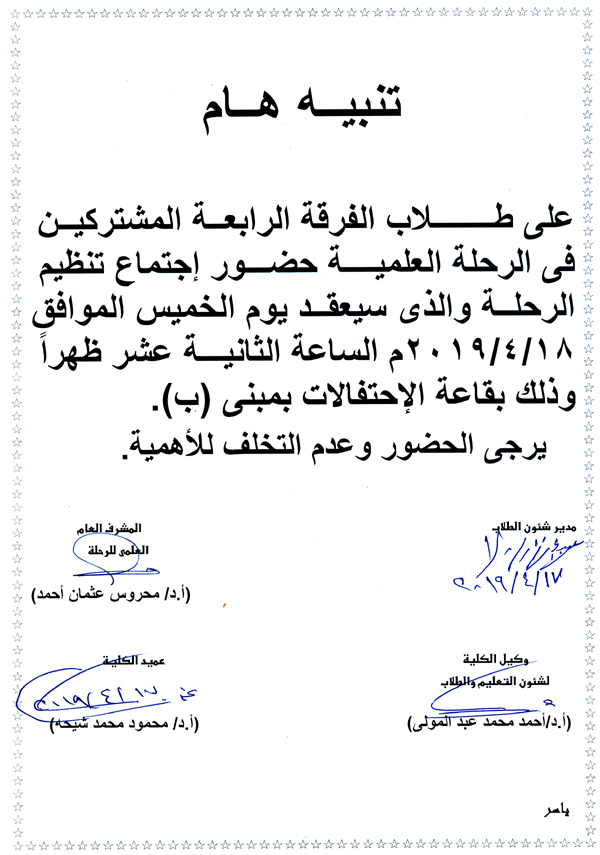 هام لطلاب الفرقة الرابعة المشتركين في الرحلة العلمية .. اجتماع تنظيم الرحلة يوم الخميس الموافق 18-4-2019م. 17 أبريل 2019 هام لطلاب الفرقة الرابعة المشتركين في الرحلة العلمية .. اجتماع تنظيم الرحلة يوم الخميس الموافق 18-4-2019م.