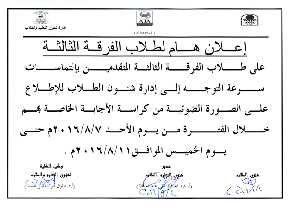 هام لطلاب الفرقة الثالثة المتقدمين بإلتماسات للإطلاع علي صورة ضوئية من كراسة الإجابة. 4 أغسطس 2016 هام لطلاب الفرقة الثالثة المتقدمين بإلتماسات للإطلاع علي صورة ضوئية من كراسة الإجابة.