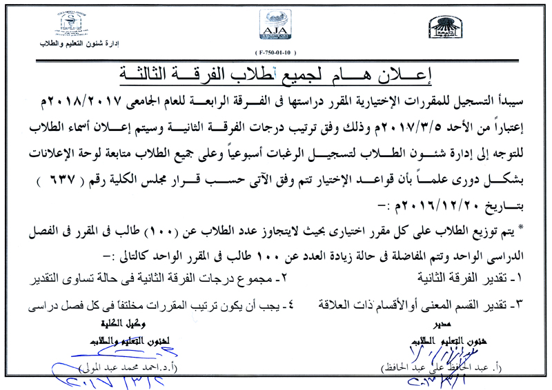 هام لطلاب الفرقة الثالثة – سيبدأ التسجيل للمقررات الاختيارية المقرر دراستها بالفرقة الرابعة للعام الجامعي 2017/2018م إعتباراً من يوم الأحد الموافق 5/3/2017م.