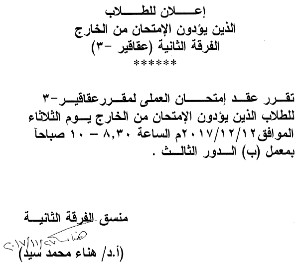 هام لطلاب الفرقة الثانية الذين يؤدون الامتحان من الخارج بخصوص الامتحان العملي لمادة عقاقير-3. 5 ديسمبر 2017 هام لطلاب الفرقة الثانية الذين يؤدون الامتحان من الخارج بخصوص الامتحان العملي لمادة عقاقير-3.