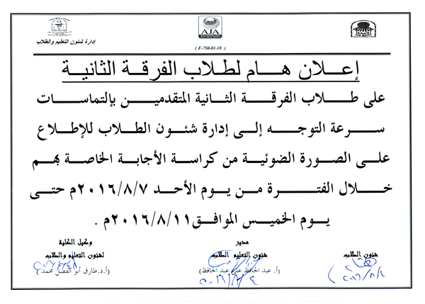هام لطلاب الفرقة الثانية المتقدمين بإلتماسات للإطلاع علي صورة ضوئية من كراسة الإجابة. 4 أغسطس 2016 هام لطلاب الفرقة الثانية المتقدمين بإلتماسات للإطلاع علي صورة ضوئية من كراسة الإجابة.
