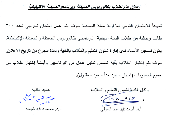 هام لطلاب بكالوريوس الصيدلة وبرنامج الصيدلة الإكلينيكية .. سوف يتم عمل امتحان تجريبي تمهيداً للامتحان القومي لمزاولة مهنة الصيدلة لعدد 200 طالب وطالبة من طلاب السنة النهائية.
