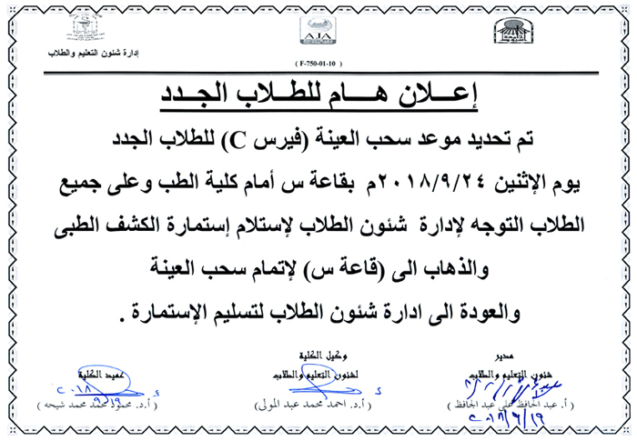 هام لطلاب كلية الصيدلة الجدد – تقرر سحب عينة فيروس سي يوم الاثنين 24-9-2018م. 19 سبتمبر 2018 هام لطلاب كلية الصيدلة الجدد – تقرر سحب عينة فيروس سي يوم الاثنين 24-9-2018م.