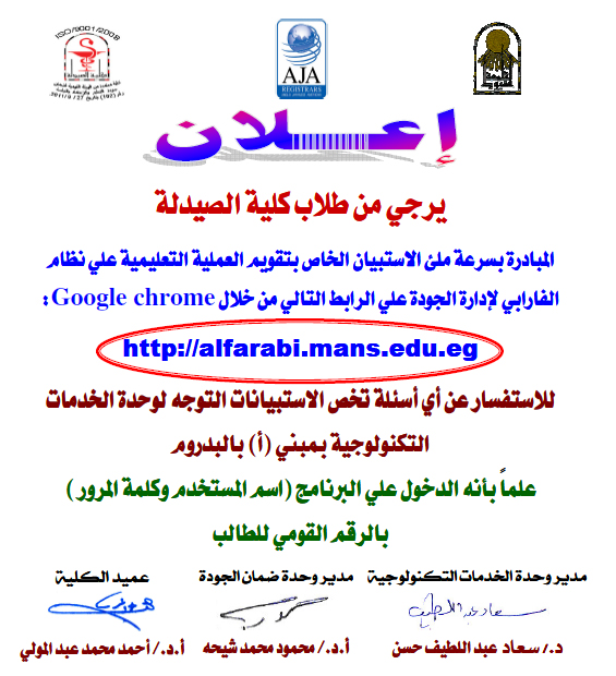 هام لطلاب كلية الصيدلة بسرعة المبادرة بملئ الاستبيان الخاص بتقويم العملية التعليمية علي نظام الفارابي لإدارة الجودة. 28 نوفمبر 2017 هام لطلاب كلية الصيدلة بسرعة المبادرة بملئ الاستبيان الخاص بتقويم العملية التعليمية علي نظام الفارابي لإدارة الجودة.