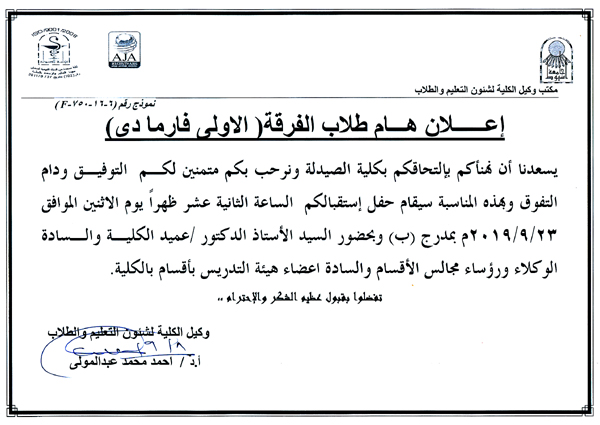 حفل استقبال طلاب الفرقة الأولى فارمادي يوم الاثنين الموافق 23-9-2019م. 15 سبتمبر 2019 حفل استقبال طلاب الفرقة الأولى فارمادي يوم الاثنين الموافق 23-9-2019م.