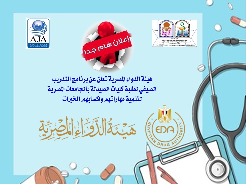 هيئة الدواء المصرية تعلن عن برنامج التدريب الصيفي لطلبة كليات الصيدلة بالجامعات المصرية لتنمية مهاراتهم واكسابهم الخبرات