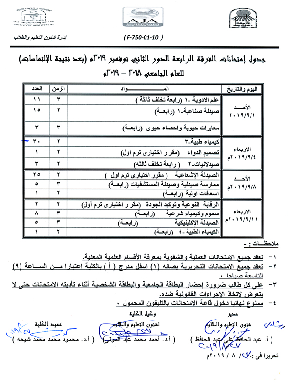 جدول إمتحان التخلفات للفرقة الرابعة "دور نوفمبر" للعام الجامعي 2018-2019م بعد الالتماسات. 27 أغسطس 2019 جدول إمتحان التخلفات للفرقة الرابعة "دور نوفمبر" للعام الجامعي 2018-2019م بعد الالتماسات.