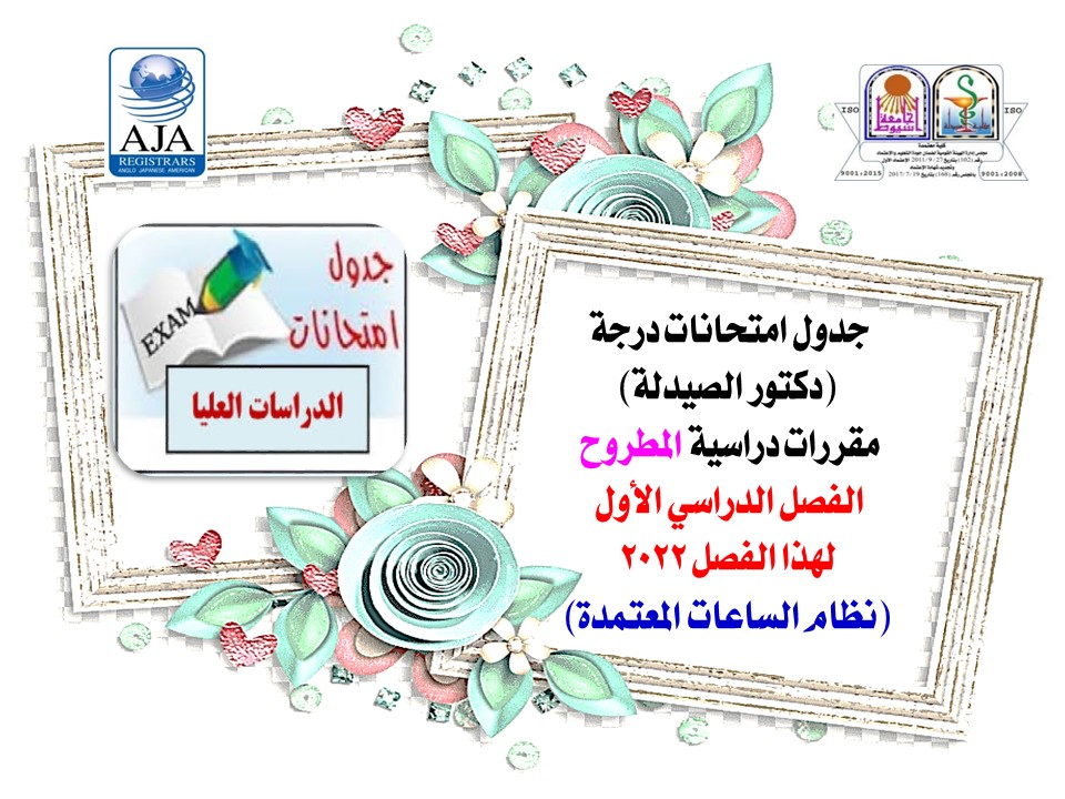 جدول امتحانات درجة (دكتور الصيدلة) مقررات دراسية المطروح الفصل الدراسي الأول لهذا الفصل 2022 (نظام الساعات المعتمدة) 2 أغسطس 2022