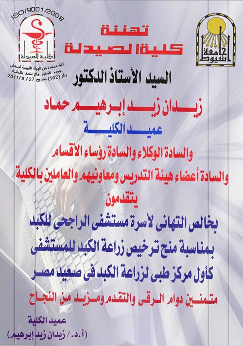 كلية الصيدلة تتقدم بخالص التهنئة لأسرة مستشفي الراجحي للكبد بمناسبة منح ترخيص زراعة الكبد للمستشفي كأول مركز طبي لزراعة الكبد في صعيد مصر. 1 سبتمبر 2014 كلية الصيدلة تتقدم بخالص التهنئة لأسرة مستشفي الراجحي للكبد بمناسبة منح ترخيص زراعة الكبد للمستشفي كأول مركز طبي لزراعة الكبد في صعيد مصر.