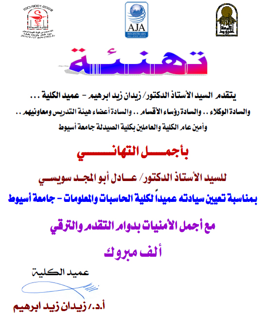 كلية الصيدلة تتقدم بخالص التهنئة للسيد الأستاذ الدكتور/ عادل أبو المجد سويسي بمناسبة تعيين سيادته عميداً لكلية الحاسبات والمعلومات - جامعة أسيوط. 26 يناير 2015 كلية الصيدلة تتقدم بخالص التهنئة للسيد الأستاذ الدكتور/ عادل أبو المجد سويسي بمناسبة تعيين سيادته عميداً لكلية الحاسبات والمعلومات - جامعة أسيوط.